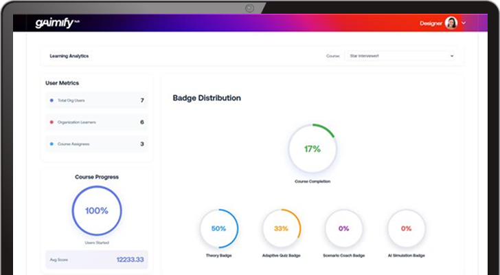 Δεδομένα που οδηγούν την απόδοση. Το gAImify Hub μετατρέπει τα ακατέργαστα δεδομένα συμμετοχής σε έναν καθαρό χάρτη οργανωσιακών ικανοτήτων. Ο πίνακας analytics προσφέρει μια λεπτομερή εικόνα για το πώς οι εκπαιδευόμενοι αλληλεπιδρούν με το περιεχόμενό σας, επιτρέποντάς σας να μετράτε την εξέλιξη σε κάθε διάσταση της μαθησιακής εμπειρίας.