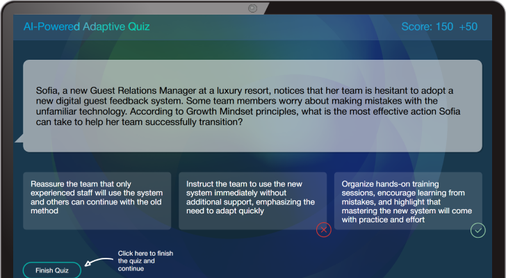 Supercharge assessment with a dynamic engine that adapts in real time to each learner’s level, pace, and knowledge gaps, right inside in the SCORM file in your existing LMS. Questions evolve from your competency framework and contentscaling difficulty as mastery grows, while rubrics deliver crystal-clear, actionable feedback. No content rebuilds, just measurable skill growth and higher completion quality.