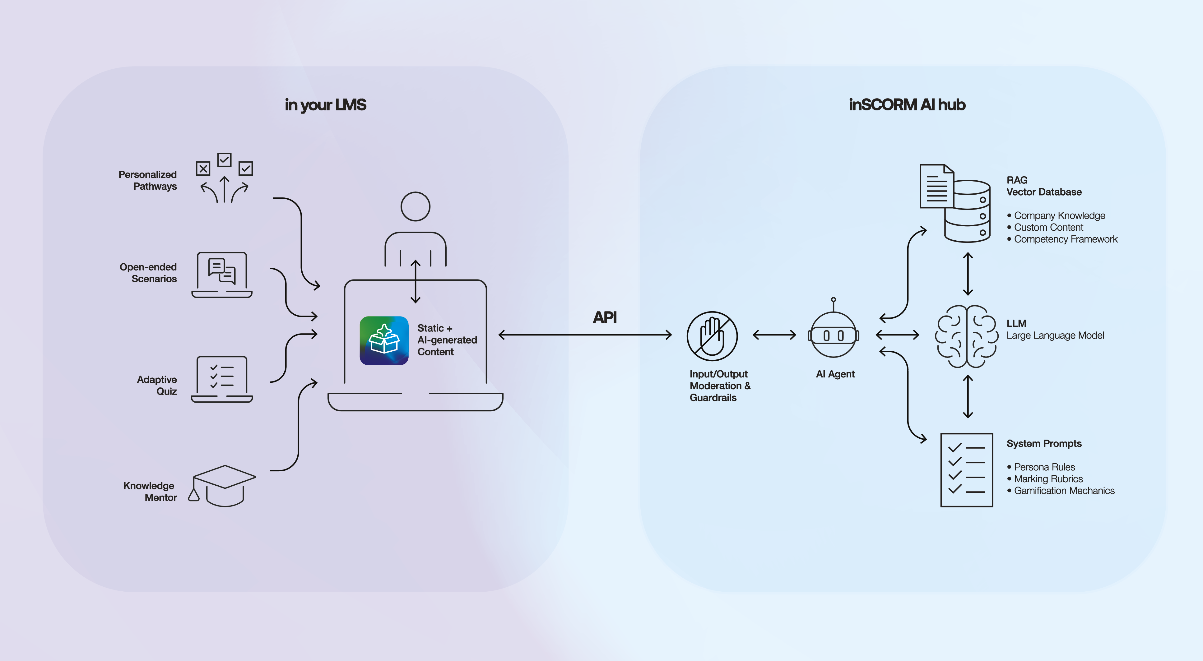 • inSCORM AI Hub orchestrates multiple specialist agents around the LLM with a RAG knowledge base for approved content and pedagogy assets.